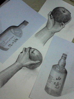 今日の画像は、ちゃんと描いたビン。と、後から手直しを加えたリンゴと手です。